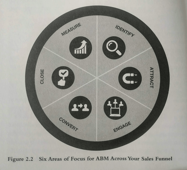 Demandbase uses a 6-component approach to illustrate parts of the ABM system, or the “Six areas of focus for ABM across your sales funnel” (image from the book):