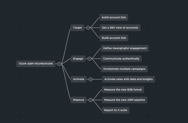 Terminus’ framework is TEAM, standing for target, engagement, activation, and measuring. Its components are illustrated in the below mindmap: